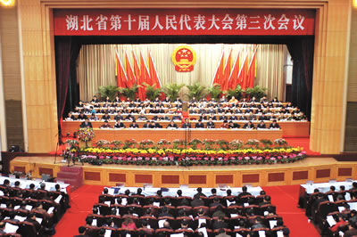 上午9時(shí),主席團(tuán)常務(wù)主席楊永良主持開幕大會(huì)。本次會(huì)議應(yīng)到代表727人,實(shí)到代表682人,符合法定人數(shù)。他宣布:湖北省第十屆人民代表大會(huì)第三次會(huì)議開幕。