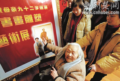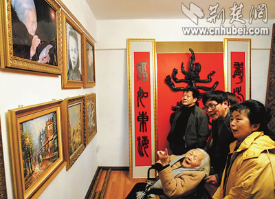 “這是特意為您準(zhǔn)備的生日禮物!”年過六旬的盧永瀚攙扶著92歲的母親,在根雕、油畫面前仔細(xì)講解!斑@個(gè)根雕是壽字!”孫女插話說:“就是祝您長壽,活過100歲!”慧老太太邊看邊比劃著,樂得合不攏嘴,用濃重的江浙口音說:“好、好!”