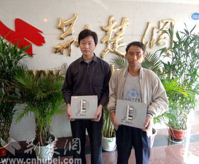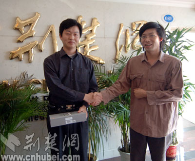 荊楚網(wǎng)24日訊 記者艾丹 潘頔 報(bào)道:23日抽出的“讀報(bào)紙、發(fā)短信、中手機(jī)”活動(dòng)的兩位幸運(yùn)獲獎(jiǎng)?wù),武漢的李先生和谷城的孟先生,今天下午來(lái)到荊楚網(wǎng)領(lǐng)獎(jiǎng),荊楚網(wǎng)總編輯閻思甜親自為他們頒獎(jiǎng)。
