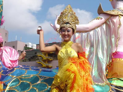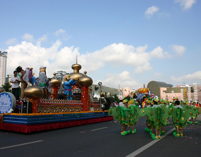 今天上午在新海廣場(chǎng)舉行的第六屆大連狂歡節(jié),更是使歡樂(lè)的海洋里掀起了歡樂(lè)的海潮。來(lái)自國(guó)內(nèi)外的24支狂歡巡游隊(duì)伍,以花團(tuán)錦簇的民族服裝和極度夸張的藝術(shù)手法,演繹了航天、花神、特洛伊木馬、梁山伯與祝英臺(tái)、孔雀仙子、海底動(dòng)物、蝴蝶服飾、阿凡提、醉酒、美人魚、回娘家、貓友、豪華游覽馬車、日月潭傳說(shuō)、堂吉訶德、木偶奇遇、狐假虎威、寶蓮燈、海娃與王子、小櫻丸子、尼爾斯騎鵝記、阿里巴巴、輪滑表演等國(guó)內(nèi)外著名童話,電影故事等。最為耀眼的是以音樂(lè)劇《貓》的扮相出場(chǎng)的表演隊(duì)伍,他們獨(dú)特的表演和造型贏得了在場(chǎng)觀眾最多的歡呼聲?駳g的服裝藝術(shù)巡游,吸引了數(shù)萬(wàn)國(guó)內(nèi)外游客和當(dāng)?shù)孛癖姷挠^賞。