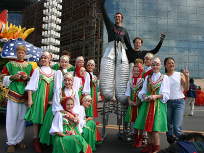 在遍布大連城100多個(gè)廣場(chǎng)上,形式多樣的民間文體活動(dòng),與狂歡節(jié)巡游隊(duì)伍遙相呼應(yīng)。