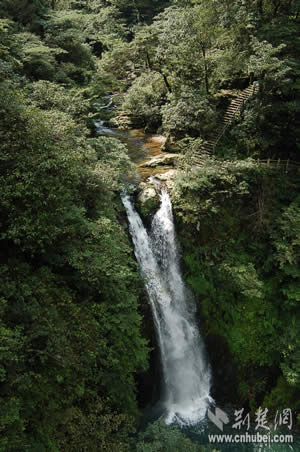 參觀完兩處紅色旅游景點之后,記者們順道觀光了龍?zhí)讹L景區(qū)。龍?zhí)段挥诖钠何鞅逼吖,是近年來開發(fā)的以自然與人文景觀相結(jié)合的旅游風景區(qū)。據(jù)介紹,當?shù)氐奈迳窈邮驱執(zhí)丁拔逄妒似佟钡脑慈。溪水沖擊小井峽谷后,陡然跌落絕壁之下,又連續(xù)飛下四級斷崖,形成梯狀的五個氣勢磅礴的瀑布和深潭,這就是碧玉、金鎖、珍珠、飛鳳、玉女等五潭五瀑。細察五潭,碧水泱泱,樹影幢幢,崖壁如刀削斧鑿,崖腳怪石,汀芷競秀,綠蔭覆蓋四周。仰觀五瀑,潭潭無俗水,瀑瀑似神女。