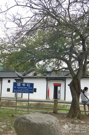 舊居坐落在大井村中央,因墻壁為白色,慣稱它為"白屋"。這棟房子共有44間,五個天井,面積近千平方米。毛澤東率領(lǐng)工農(nóng)紅軍首次到達大井時就住在這里,此后便成為毛澤東在大井的住地。1929年1月底,這棟房子被敵人燒毀,僅剩下一堵殘墻、屋后的兩棵樹和房前草坪上的一塊大石頭。1960年,當?shù)卣丛残迯,將殘墻嵌入新墻之中作為紀念。屋前的有塊大石頭因毛澤東時常坐在上面看書讀報、批閱文件,被人稱為“讀書石”。