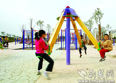 荊楚網(wǎng)(楚天都市報(bào))(記者潘勤 朱熙勇攝)旋轉(zhuǎn)的飛輪、高蕩的秋千——日前,記者在漢口江灘三期工地看到:這里剛剛建起的大型群眾健身園里,已有孩子先玩為快了。