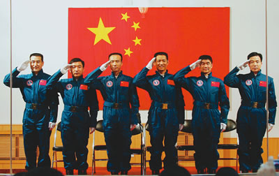 昨日,6位中國航天員在酒泉衛(wèi)星發(fā)射中心航天員公寓———問天閣的一個(gè)大廳內(nèi)集體亮相。由左至右是:翟志剛、吳杰、費(fèi)俊龍、聶海勝、劉伯明、景海鵬。新華社記者趙建偉攝