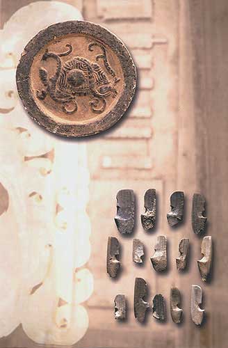 玄武紋瓦當(dāng):建筑構(gòu)件(上,直徑19厘米)