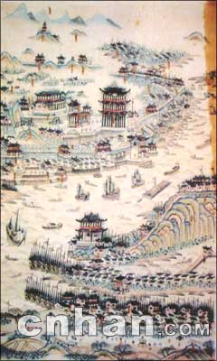 此圖藏于大連市圖書館,手繪彩圖。未標(biāo)明作者姓名和成圖時(shí)間,圖中標(biāo)注了武昌、漢口“龍王廟”等。筆者鑒定此圖為清代中期作品,根據(jù)是圖中有“龍王廟”,而龍王齋建于乾隆四年(1739年),故此圖當(dāng)于1739年以后所繪。但圖中沒有出現(xiàn)漢口城堡,而漢口城堡建于1864年,同時(shí)圖中只繪有木帆船,而未出現(xiàn)現(xiàn)近代輪船。武漢江面出現(xiàn)航運(yùn)和輪船是1862年以后?芍藞D當(dāng)成于1862年前?纱篌w界定此圖繪于1739年至1862年之間。