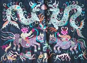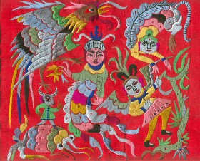 苗繡 刺繡,是苗族婦女盛裝不可或缺的飾物,主要有領(lǐng)花、肩花、襟花、背塊花、袖口花、裙鑲花、帽頂花、帽頂花等品種。苗族刺繡,整體上多為幾何構(gòu)圖,古樸多姿。其圖案因繡片條、塊的不同,分為幾何二方連續(xù)式和四方連續(xù)式構(gòu)圖。其圖案取材于生活中常見的草木、鳥獸、蟲魚、器具等。圖案的整體布局一般以菱形為立體紋樣,常見的是大菱形中套小菱形,小菱形又分別由不同色彩的方、圓、三角點狀組成。條狀繡片,多用點、線或線面組合,一整二剖構(gòu)圖。繡片是按布的經(jīng)緯戳針,故曲線多折角。大塊繡片,如背塊花等,多用菱形四方連續(xù)構(gòu)圖,并在其中布以對稱的變形幾何點及其他折線。所有繡片,粗看五彩斑斕,細(xì)觀則不同色線組圖分明,交錯重疊,既復(fù)雜多變又結(jié)構(gòu)嚴(yán)謹(jǐn)、條理清晰。繡法很多,有平繡、凸繡、辮繡、堆花、縐繡、纏繡、挑繡、抽花等。平繡是最曾遍的繡法。這種繡法是重于圖案布局的美觀勻稱,色調(diào)鮮明,有明顯的物象感。凸繡流行于凱里、臺江部分地區(qū),它是在底布上多鋪幾層紙花,使所繡圖案凸出,有立體感。辮繡只在雷公山巴拉河一帶流行,其方法是將若干根色線編成辮子,按設(shè)計圖案平鋪于底布上,用絲線釘牢即成。圖案色調(diào)大致是青年女子鮮艷,中年以上婦女稍渾暗。如凱里、黃平、施秉等地,姑娘及較年輕婦女的盛裝刺繡以青布作底,繡大紅,間有少量白黃綠之色,亮麗醒目;中年以上婦女盛裝刺繡,亦以青布作底,以紫藍(lán)為基調(diào),間以少許桔紅、綠、白等色,顯得深沉穩(wěn)重。 京繡 京繡又稱宮繡,明清時期開始大為興盛,多用于宮廷裝飾、服飾,用料講究、技術(shù)精湛、格調(diào)風(fēng)雅,民間高檔的宮繡大都與皇宮有著千絲萬縷的聯(lián)系。京繡屬手工刺繡,所以在今天機繡發(fā)達(dá)的時候,為區(qū)別于機繡又名“手繡”。京繡在解放后,逐漸形成了自己鮮明的藝術(shù)特點與風(fēng)格,其選料精當(dāng)貴重,針工巧妙得體,色彩絢麗豪華,格調(diào)高雅。其中最好為針工中的“平金打籽”繡。這種繡,是以真金捻線盤成圖案,或結(jié)籽于其上,十分精致,華貴。 發(fā)繡 發(fā)繡,又稱“墨繡”。是以人的頭發(fā)為材料,在綢緞、絲絹或滌綸布上精心繡制的特種藝術(shù)品。具有淡雅、不褪色、耐腐蝕、利于收藏等特點。彩色發(fā)繡是相對于單色發(fā)繡而言,它是指以不同人種的天然色澤發(fā)絲為材料,遵循色彩規(guī)律,在繃平整的布帛上施針度線,塑造形象的藝術(shù)。作品的質(zhì)感效果特別好, 畫面有微妙的色彩變化,層次較單色發(fā)繡豐富,技巧靈活多變,形象更加栩栩如生。 材料的特質(zhì)屬性賦予發(fā)繡藝術(shù)獨特的魅力,具有豐富的人文內(nèi)涵,如用自己的頭發(fā)繡一幅寫真“二我”,具有生命的直接紀(jì)念意義。作品集繪畫與刺繡為一體,具有一定的美學(xué)價值和經(jīng)濟價值,又能經(jīng)久保存,千年不變,可謂收藏極品。 甌繡 由于溫州地處甌江之濱,故得名“甌繡”。400多年以前,浙江溫州地區(qū)已運用刺繡美化服飾, 繡品技藝也達(dá)到相當(dāng)水平。據(jù)說甌繡最早產(chǎn)生于民間婦女之手,那時的刺繡品種有衣服、小兒帽 圈、圍涎、錦肚、婦女鞋面、枕頭、荷包等。題材只有花鳥魚蟲之類。甌繡真正成為供欣賞的藝 術(shù)品只有60多年歷史。1922年前后,溫州刺繡藝人林森友在上海一家刺繡莊發(fā)現(xiàn)了湘繡畫片, 回來后開辦了“美艷”刺繡作坊,仿照湘繡畫片的技法,改進(jìn)甌繡生產(chǎn)。從此,溫州出現(xiàn)了甌繡畫片。
