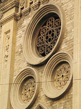③窗戶(hù)“合十”、“天圓地方”:古德寺窗戶(hù)的設(shè)計(jì)可謂別具一格。寶殿墻上可見(jiàn)三個(gè)一組的圓窗,分別為哥特風(fēng)格和中國(guó)的八卦圖;圓窗下是形如竹筍的花窗,象征著佛祖雙手合十的姿態(tài);回廊里的窗戶(hù)則上圓下方,取“天圓地方”之意。