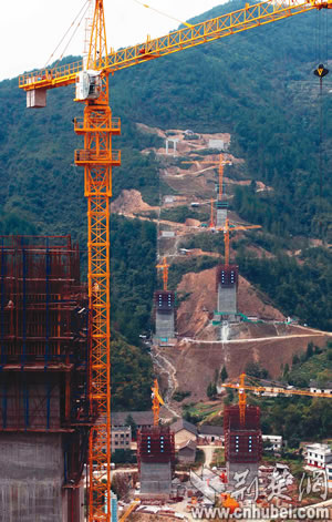 龍?zhí)逗犹卮髽蚓o鄰長(zhǎng)陽(yáng)縣榔坪鎮(zhèn),是滬蓉西高速公路上一座T構(gòu)箱梁橋,主橋墩最高178米,居世界同類(lèi)橋高墩之最!耙(jiàn)過(guò)這么高的塔吊沒(méi)?”戴上安全帽,湖北路橋公司項(xiàng)目經(jīng)理夏君華帶記者一行踏訪工地。