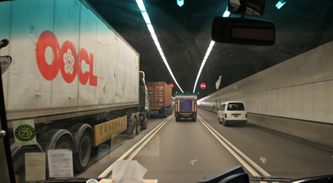 穿流不息的集裝箱貨柜車(chē)流通過(guò)海底隧道