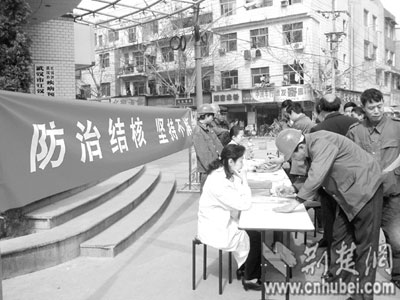 荊楚網(wǎng)(楚天都市報)(記者 盧水平 通訊員 夏瓊 項征國 攝)昨日是世界防治結(jié)核病日,江漢區(qū)疾控中心為附近幾個建筑工地的280名農(nóng)民工,進(jìn)行免費(fèi)結(jié)核病透視篩查,結(jié)果發(fā)現(xiàn)5例可疑肺結(jié)核病人。據(jù)介紹,進(jìn)城務(wù)工者及流動人口肺結(jié)核病患病率,高出市內(nèi)常住人口一倍,是目前城市結(jié)核病的重要傳染源。