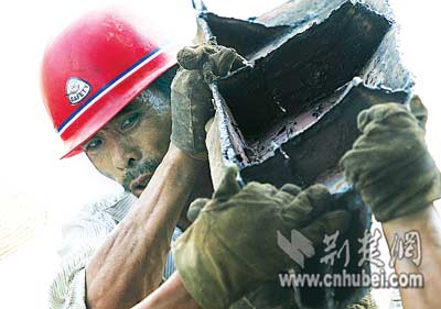 現(xiàn)場施工的8名農(nóng)民工都來自監(jiān)利縣。他們有的用焊槍切割船體,有的將割好的鋼板搬到岸上。每塊鋼板重約80公斤,兩個(gè)人抬著走,豆大的汗珠布滿黝黑的臉龐,隨著移動(dòng)的腳步一滴滴滾落地上。