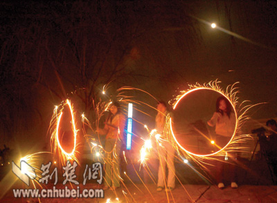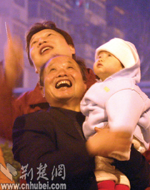 漢陽的劉春華一大家子人特別引人注目,因為他們?yōu)榇蠡镎故玖艘粓鲂⌒偷乃饺搜婊鹜頃。她的四兄弟姊妹,從面包車上扛下大包大包箱子般大小的焰火,依次在江邊擺開。不一會,幾道彩色的光柱就在天空閃耀,彩色幕布被拉開。震耳的轟響,讓孩子們又愛又怕,躲在父母的身后偷偷地捂著耳朵跳鬧。70多歲的爺爺奶奶微笑著,安靜地看著自己十多個子子孫孫們歡暢的一幕。
