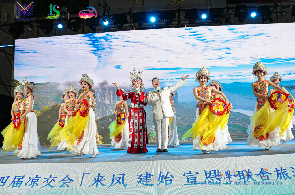 宣恩縣以“浪漫”為關(guān)鍵詞,串聯(lián)仙山貢水旅游區(qū)的璀璨夜景、彭家寨古吊腳樓的土家文化體驗(yàn)、獅子關(guān)水上浮橋的山水美景,以及矅天眼寒武紀(jì)地質(zhì)奇觀。推介官通過茶香四溢的伍家臺貢茶文化、野椒園侗族大歌、宣恩耍耍等非遺活動,展現(xiàn)“中國民間文化藝術(shù)之鄉(xiāng)”的獨(dú)特魅力。歌伴舞《施南謠》與苗族舞蹈《哩嘞響》則用藝術(shù)語描繪了宣恩的溫情與浪漫。