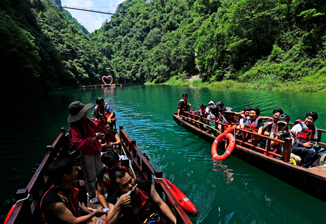 嘉賓們乘“地心奇航”方舟行于翠色江水 攝影 吳冰