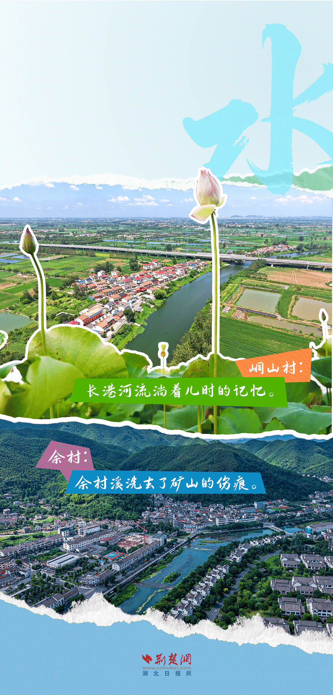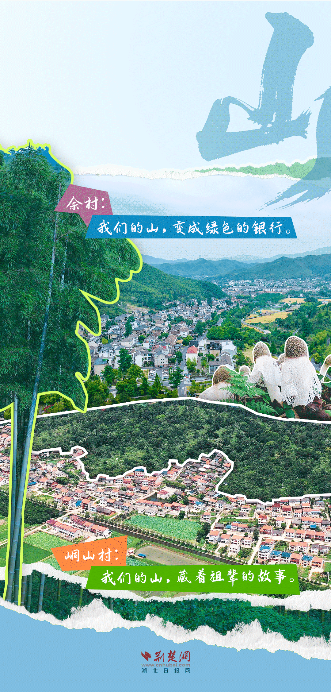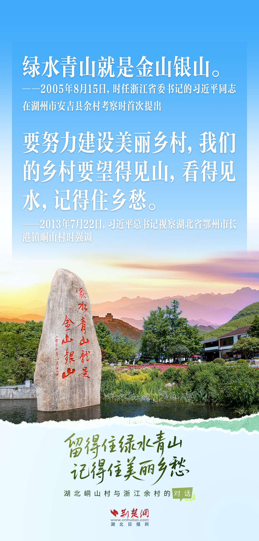 今天,荊楚網(wǎng)(湖北日報網(wǎng))推出創(chuàng)意海報《留得住綠水青山,記得住美麗鄉(xiāng)愁——湖北峒山村與浙江余村的對話》,展示中國鄉(xiāng)村的美麗畫卷。