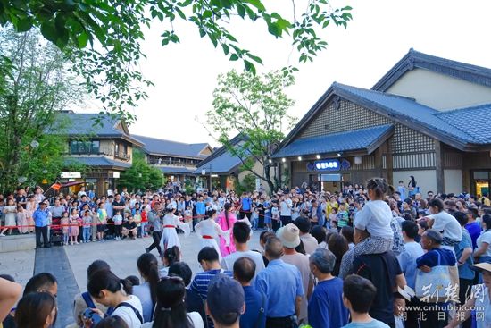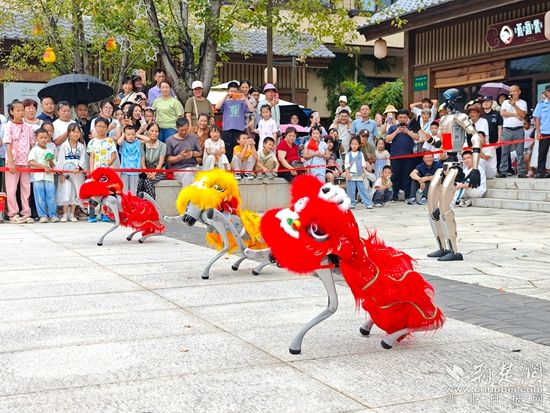 白天,智能機(jī)器人登臺(tái)唱起經(jīng)典黃梅戲,聲聲入耳;靈活的機(jī)器狗躍動(dòng)翻騰,引得觀眾連連喝彩。機(jī)器人巡游隊(duì)伍更是“身懷絕技”,握手、跳舞等表演樣樣在行,游客爭相互動(dòng)合影。