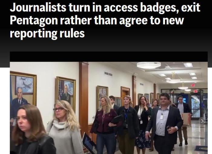 美國廣播公司(ABC)報道稱,當(dāng)?shù)貢r間15日下午4時,隨著美國國防部設(shè)定的最后期限臨近,五角大樓的走廊里堆滿了文件箱,大約40到50名記者交出了證件后一起離開。