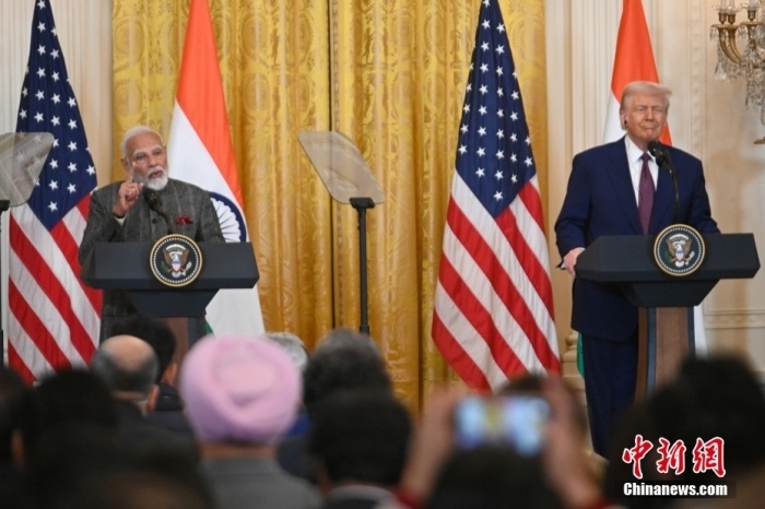 當(dāng)?shù)貢r(shí)間2月13日,華盛頓,美國總統(tǒng)特朗普與來訪的印度總理莫迪在白宮舉行會(huì)晤。圖為雙方在會(huì)晤后出席聯(lián)合記者會(huì)。中新社記者 陳孟統(tǒng) 攝