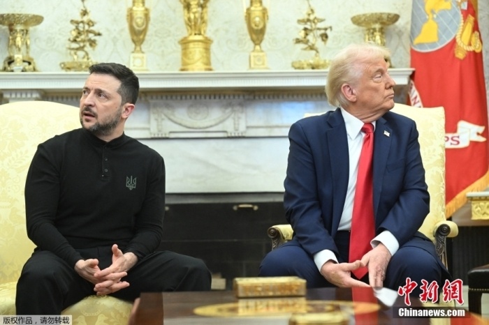 當?shù)貢r間2月28日,美國總統(tǒng)特朗普與烏克蘭總統(tǒng)澤連斯基在白宮舉行會談。會談過程中,雙方爆發(fā)激烈爭吵,澤連斯基提前離開白宮。圖為特朗普與澤連斯基會談現(xiàn)場。
