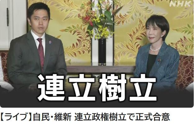 中新網(wǎng)10月20日電 據(jù)日本廣播協(xié)會(huì)(NHK)報(bào)道,當(dāng)?shù)貢r(shí)間20日,日本自民黨總裁高市早苗與日本維新會(huì)代表吉村洋文舉行兩黨黨首會(huì)談,雙方簽署了關(guān)于兩黨聯(lián)合執(zhí)政的協(xié)議文件,正式確立聯(lián)合執(zhí)政。