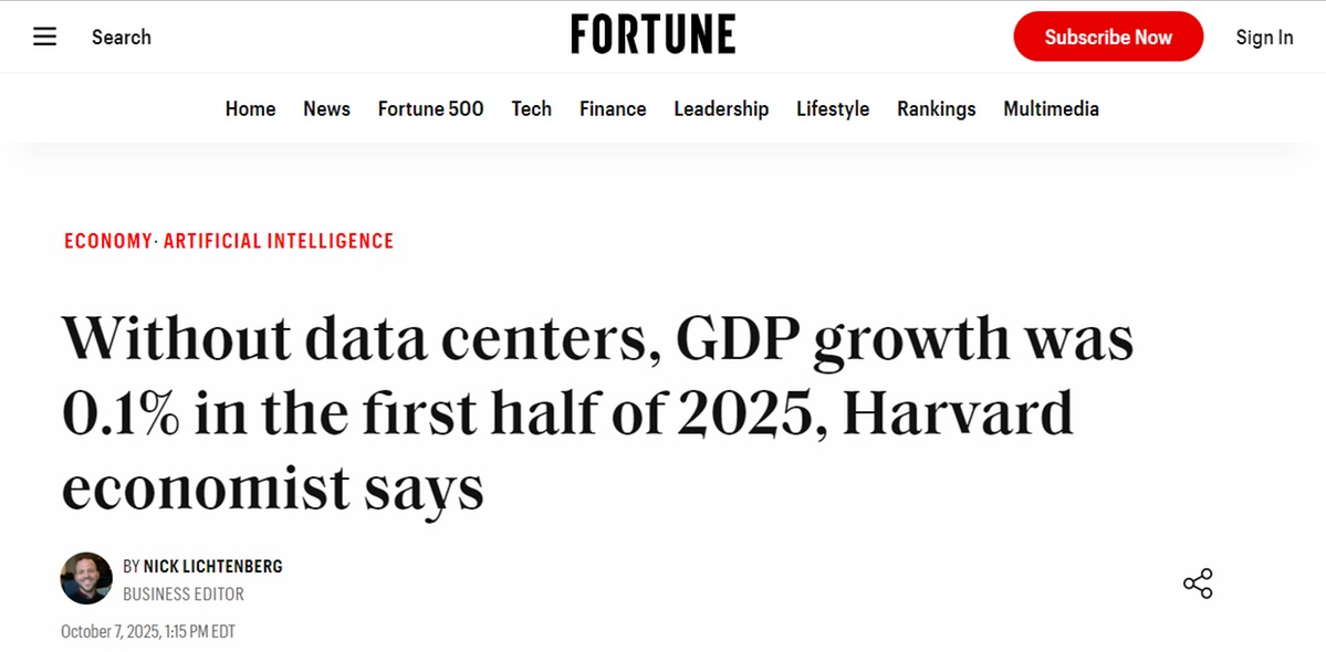2025年上半年,美國GDP增長幾乎全部依賴數(shù)據(jù)中心和AI投資,其中AI投資占比近92%。哈佛大學(xué)經(jīng)濟學(xué)家杰森·弗曼指出,若剔除這一領(lǐng)域,其余產(chǎn)業(yè)合計成長率僅0.1%,幾乎陷入停滯。