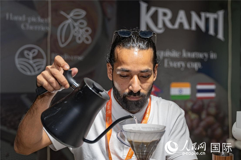 | 一名展商專心致志泡咖啡。人民網(wǎng) 塔里克·易卜拉辛攝 |