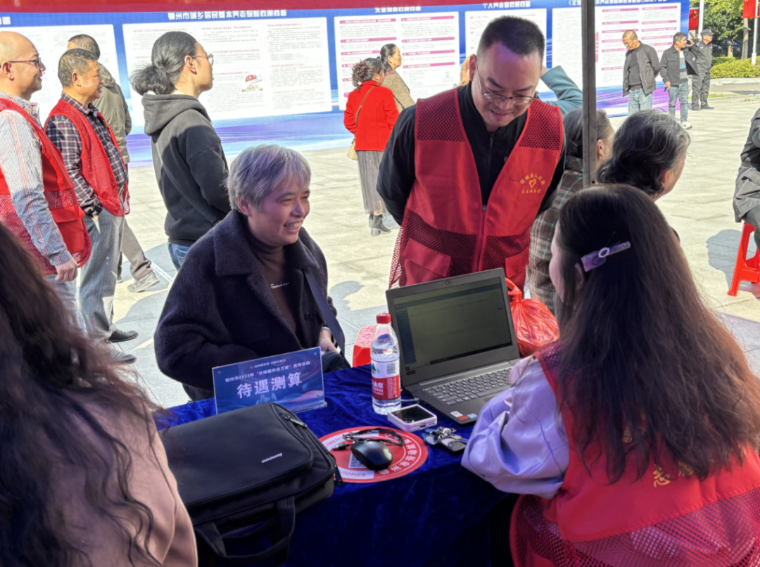 鄂州市“社保服務(wù)進(jìn)萬(wàn)家”主場(chǎng)活動(dòng)現(xiàn)場(chǎng),工作人員為即將退休的群眾測(cè)算社保待遇。