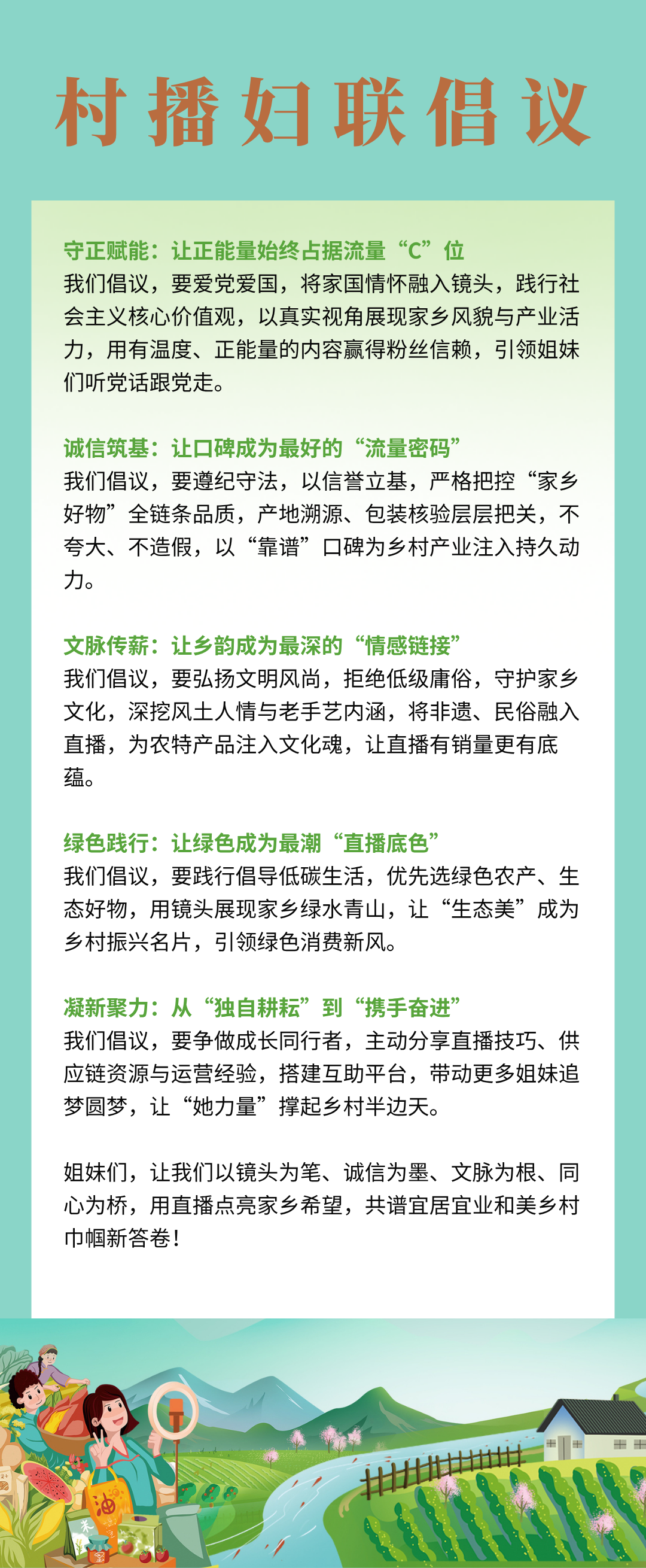 五位村播婦聯(lián)代表共同發(fā)出倡議,以“守正賦能”錨定方向、“誠(chéng)信筑基”堅(jiān)守底線、“文脈傳薪”延續(xù)根脈、“綠色踐行”繪就底色、“凝新聚力”共赴新程,號(hào)召全國(guó)的女主播們堅(jiān)守初心使命,凝聚巾幗合力,用直播點(diǎn)亮家鄉(xiāng)希望,以實(shí)干擔(dān)當(dāng)共譜和美鄉(xiāng)村巾幗新答卷。