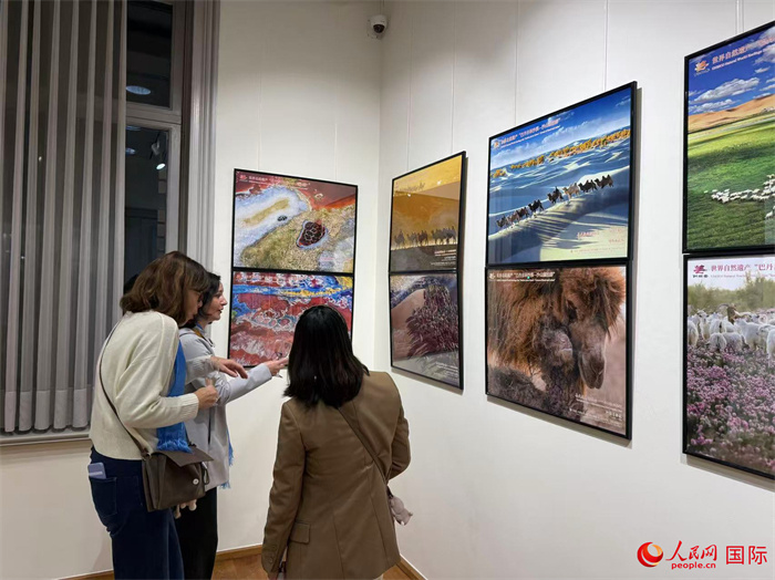 布魯塞爾的秋日午后,馬頭琴曲《天邊》的悠揚旋律在文化中心大廳回蕩,與展廳內(nèi)的影像畫面交相輝映。渾厚悠長的《蒼天般的阿拉善》樂聲,映襯著巴丹吉林沙漠的全景圖片,令人仿佛置身大漠深處。提前到場的嘉賓們饒有興致地翻閱文旅手冊與遺產(chǎn)保護資料,對這片來自中國北疆的神奇土地充滿好奇與期待。