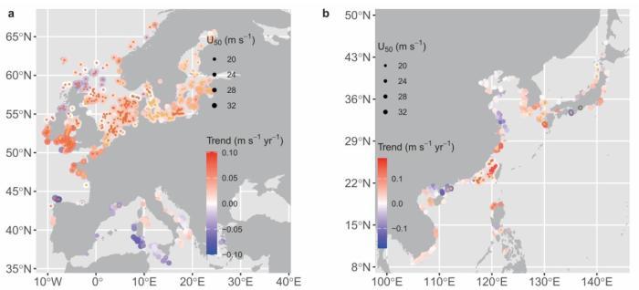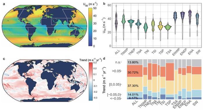 在本項(xiàng)研究中,論文共同通訊作者、南方科技大學(xué)教授曾振中和同事及合作者一起,分析了全球海洋1940年至2023年的每小時(shí)風(fēng)速數(shù)據(jù)。他們發(fā)現(xiàn),全球超過60%的沿海區(qū)域呈現(xiàn)極端風(fēng)速顯著上升的趨勢(shì),并常與全球變暖下的天氣系統(tǒng)變化相關(guān)。