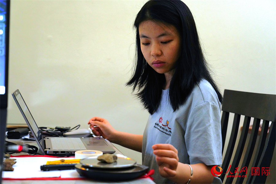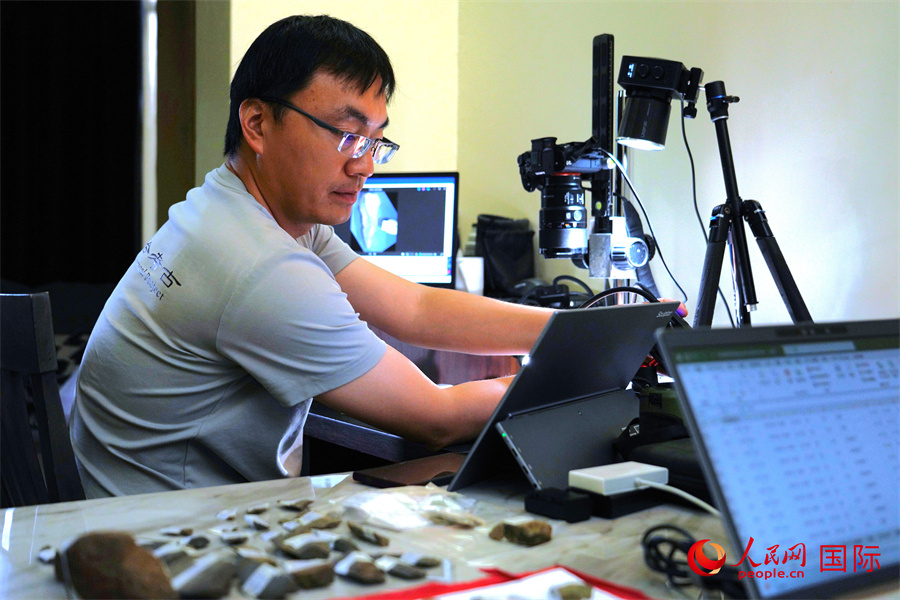 中方隊員彭勝藍(lán)對2025年調(diào)查石制品進(jìn)行測量統(tǒng)計。人民網(wǎng)記者 黃煒鑫攝