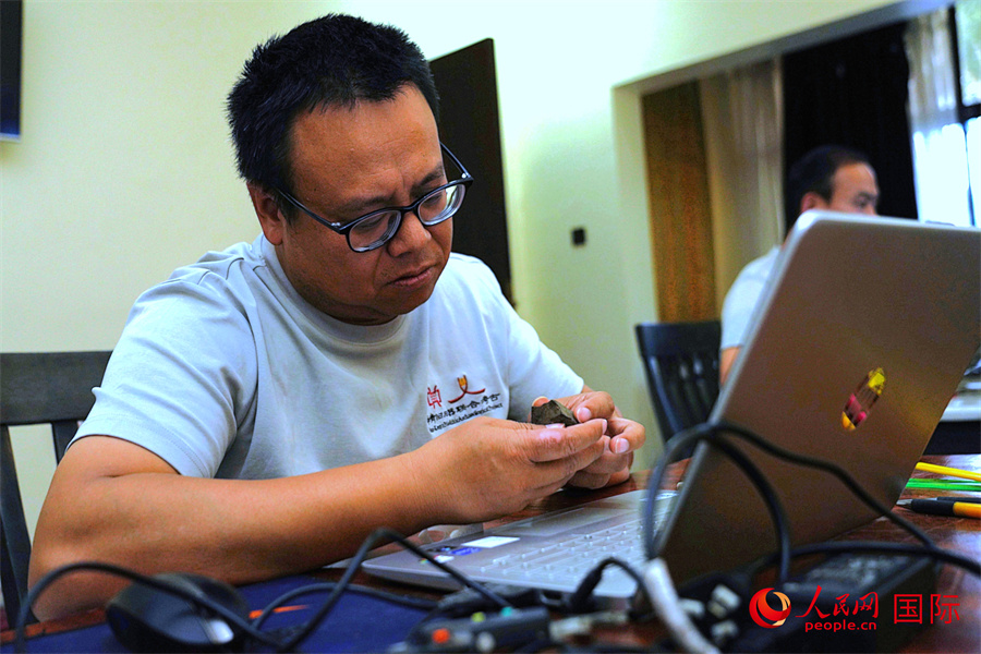 中方隊員顧雪軍對第10地點(diǎn)出土石制品進(jìn)行分類整理。人民網(wǎng)記者 黃煒鑫攝
