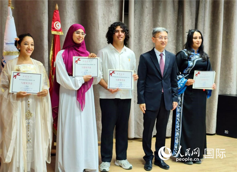 中國駐突尼斯大使萬黎與部分獲獎者合影。人民網(wǎng) 萊拉·阿提塔拉赫攝