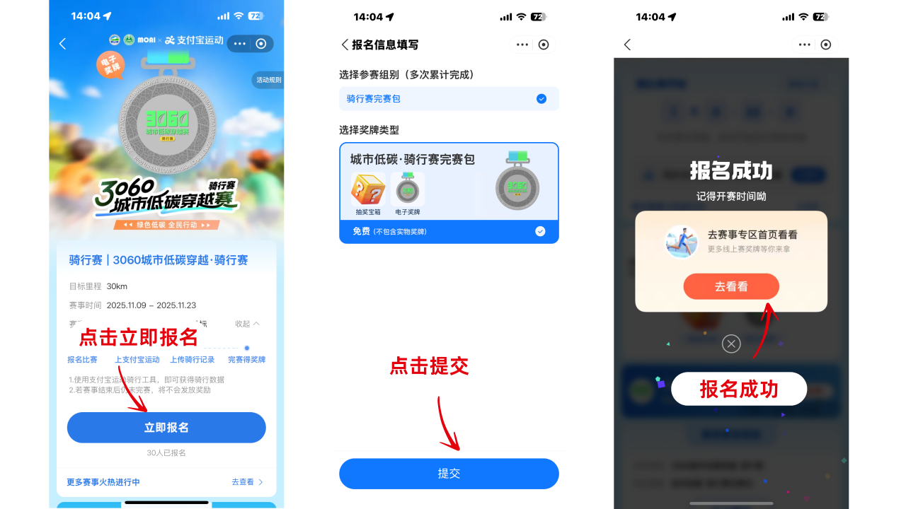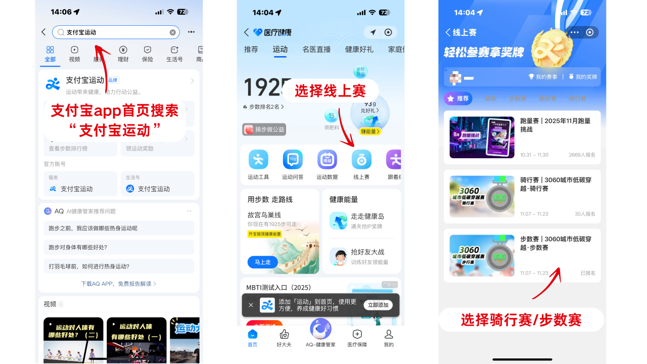 通過支付寶APP,搜索“支付寶運動”小程序進入“線上賽”專區(qū)報名參賽,或搜索“3060城市低碳穿越賽”小程序輪播頁跳轉(zhuǎn)報名。