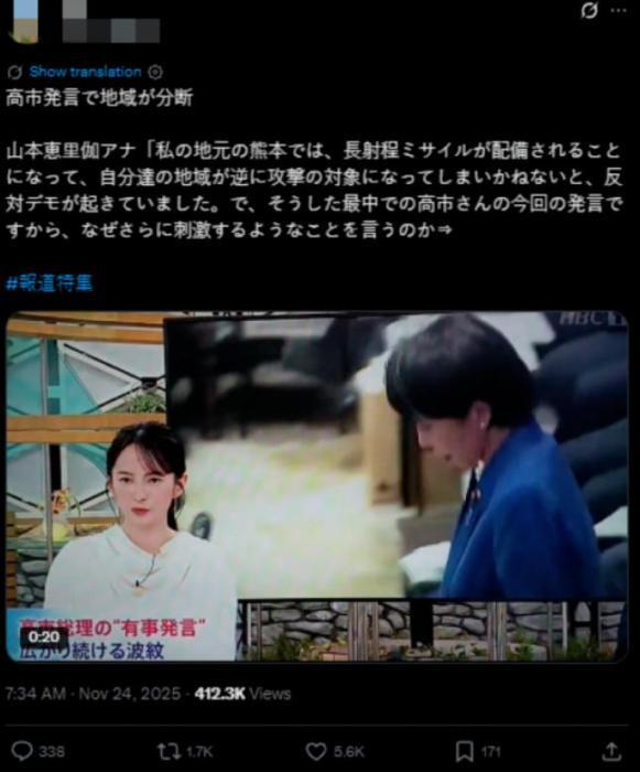 在社交媒體平臺上,一名網(wǎng)友援引日本主播的評論表示:“在我的家鄉(xiāng)熊本,由于(日本政府)決定部署長程導(dǎo)彈,當(dāng)?shù)匾殉霈F(xiàn)抗議集會(huì)。在此風(fēng)口浪尖,高市卻發(fā)表此番言論——(人們不禁質(zhì)疑)她為何要火上澆油?”