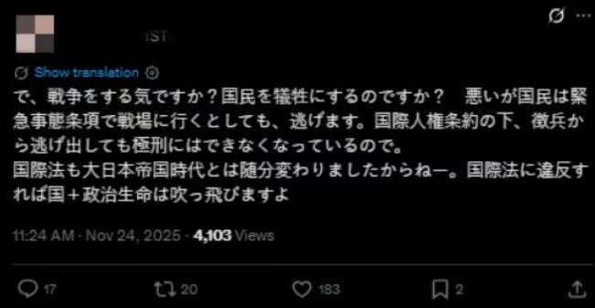 一些日本網(wǎng)友憤慨地留言道:“(高市政權(quán))是執(zhí)意要發(fā)動(dòng)戰(zhàn)爭嗎?是準(zhǔn)備讓民眾去當(dāng)‘炮灰’嗎?任何違反國際法的行為,都將導(dǎo)致該國及其決策者的政治生命徹底終結(jié)?!?/p>
