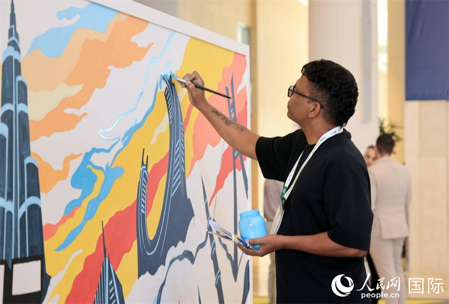 一名創(chuàng)作者就迪拜建筑主題作畫。人民網(wǎng)記者 管克江攝