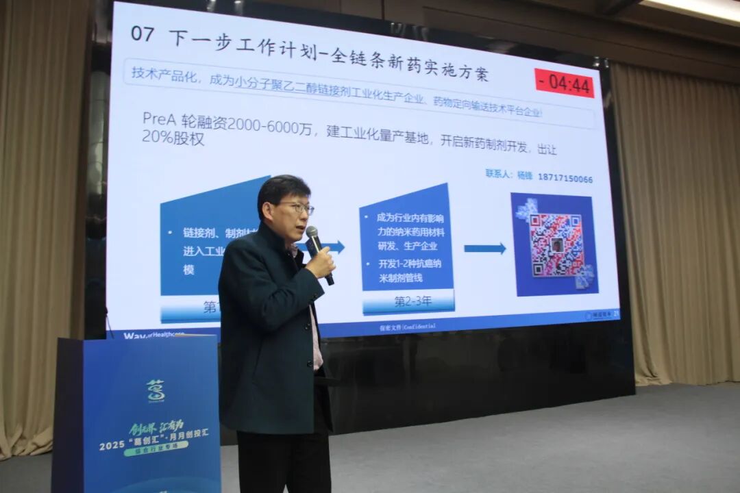項(xiàng)目路演作為核心環(huán)節(jié),六大高精尖項(xiàng)目同臺競技,展現(xiàn)從“0到1”的突破性創(chuàng)新實(shí)力??拱┘{米脂質(zhì)體制劑新材料項(xiàng)目由深耕生物醫(yī)藥領(lǐng)域多年的楊鋒博士領(lǐng)銜,其獨(dú)家單分散小分子量PEG工業(yè)化量產(chǎn)技術(shù),一舉突破脂質(zhì)體納米顆粒(LNP)生產(chǎn)瓶頸,填補(bǔ)國內(nèi)外產(chǎn)業(yè)化空白。公司主營PEG鏈接劑、ADC Linker、mRNA疫苗輔料等核心產(chǎn)品,客戶涵蓋諾華、禮來等國際巨頭,已獲國家級科技型中小企業(yè)認(rèn)定,未來聚焦個性化腫瘤治療全球化布局。