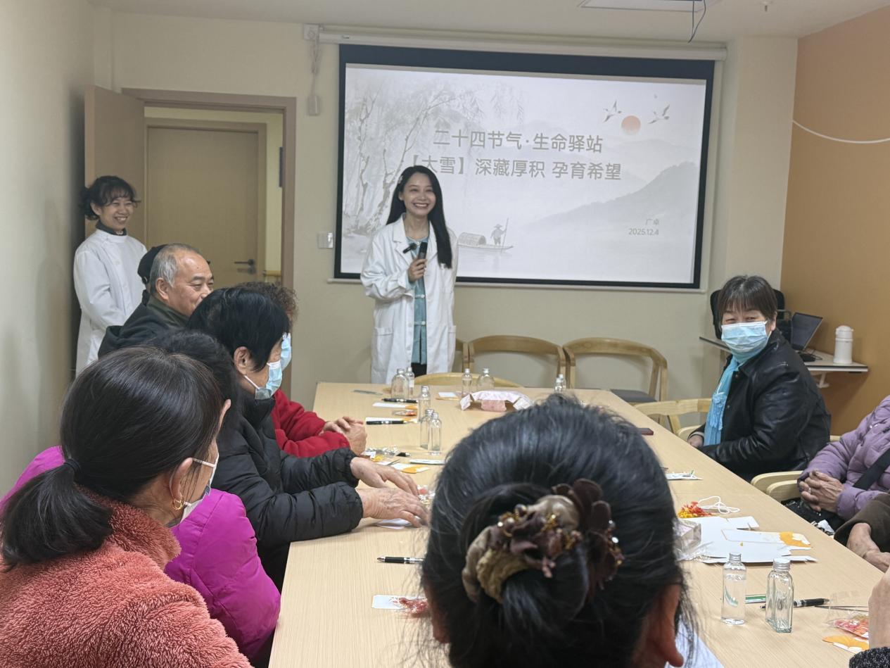 12月4日下午,武漢市洪山區(qū)梨園街道綜合養(yǎng)老服務中心內暖意融融、靜穆有序,“大雪?深藏厚積,孕育希望”二十四節(jié)氣心理團輔活動在此溫情開展。本次活動由武漢大學中南醫(yī)院血液內科聯(lián)合東湖社區(qū)衛(wèi)生服務站、梨園街道綜合養(yǎng)老服務中心、家庭健康服務中心共同舉辦,并獲韓紅基金會贊助。以“大雪”節(jié)氣為文化紐帶,深度融合傳統(tǒng)智慧與現(xiàn)代心理關懷,旨在為轄區(qū)老年人提供一場溫暖而深入的心理團輔。