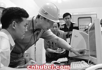 三峽總公司總經理陸佑楣在泄水閘集控室現(xiàn)場了解泄洪閘監(jiān)控情況。